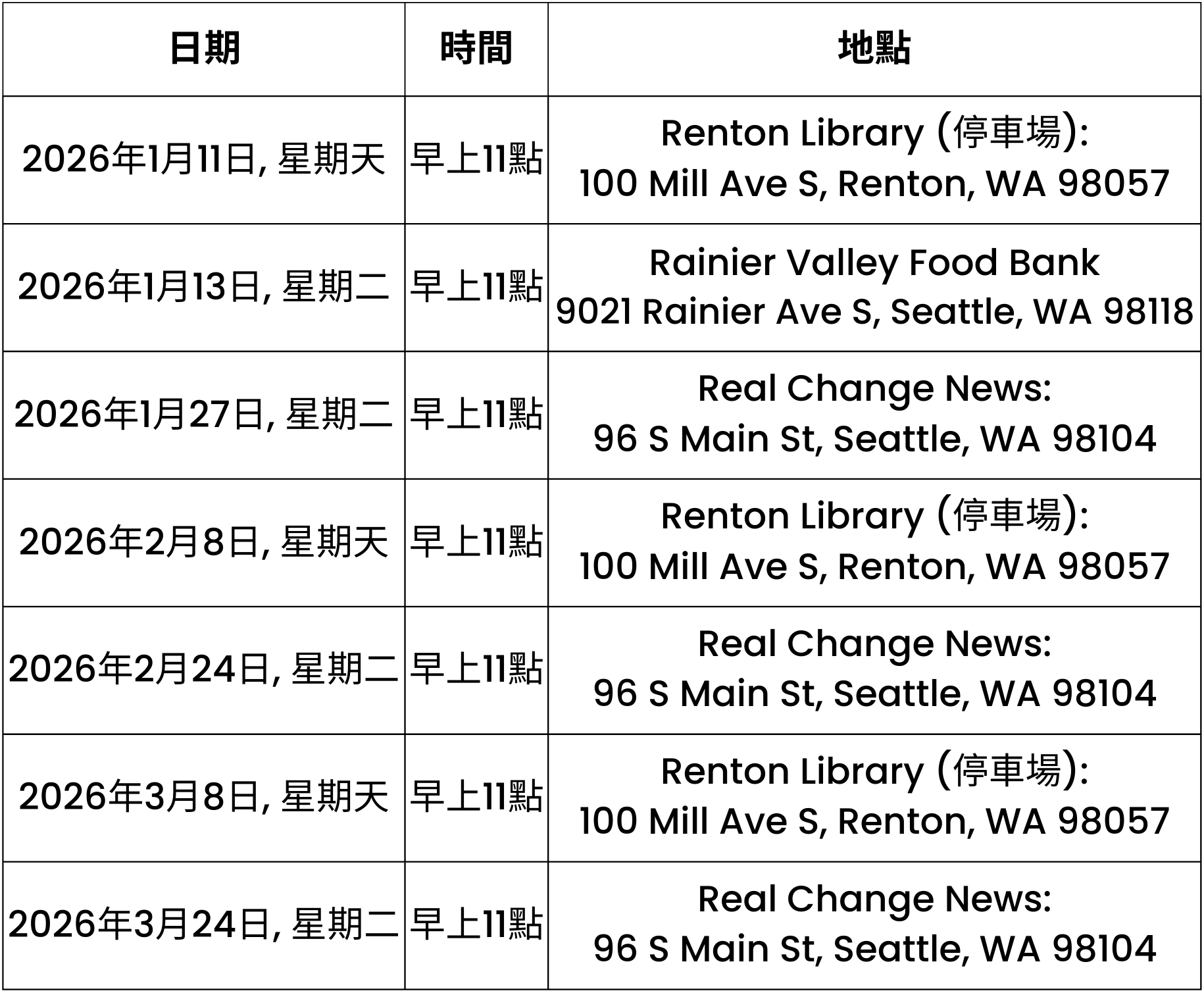 English Español 金郡門診時間表及服務項目 門診無需預約,依照到場時間排列看診順序。我們建議您於診所開始時間前至少一小時先到場登記。我們會盡快完成為每個家庭提供高品質的寵物護理。由於我們是一個由義工組成的小團隊,每次能看診時間及人數有限,不能保證可以照顧到每隻來到診所的寵物。等待看診需要等待一段時間,因此請攜帶您及毛小孩在等待期間所需要的物品。感謝您的理解和耐心! 家庭收入條件 Washington Health Outreach 提供免費及平價的寵物醫療給收入不超過2025年聯邦貧困線兩倍的名眾,請參見表格 。