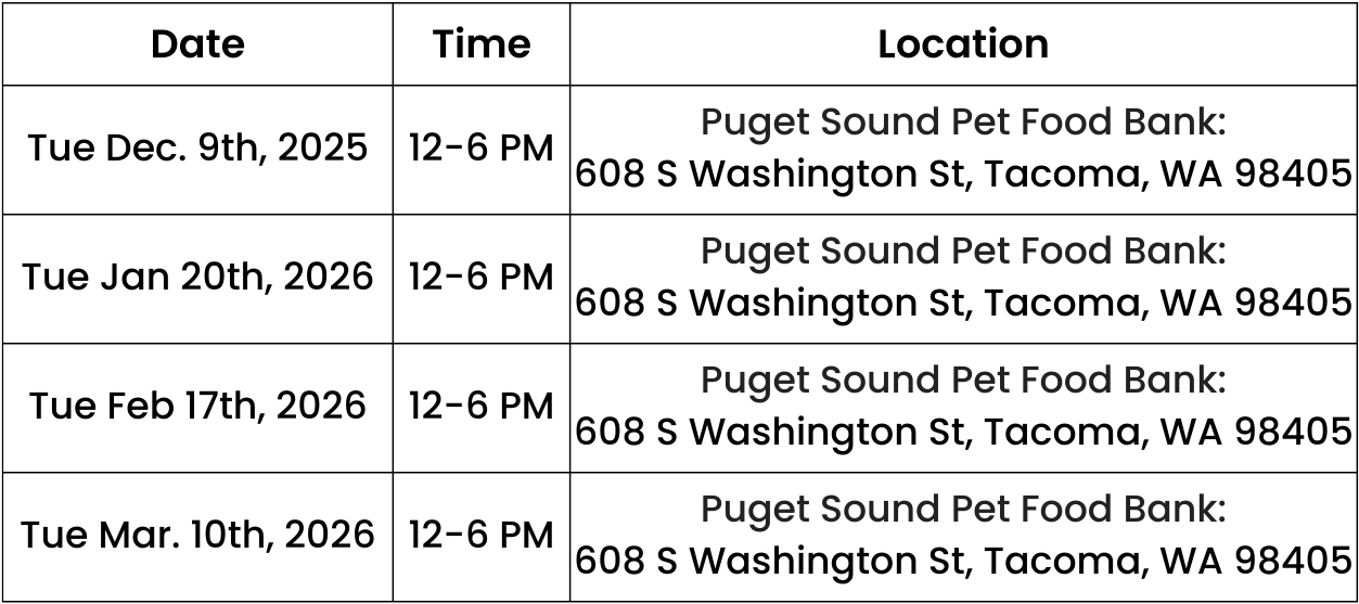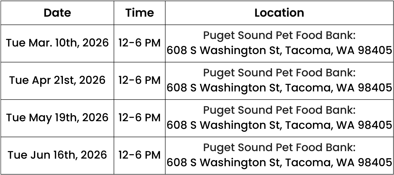 All services at Puget Sound Pet Food Bank are for Pierce County residents by appointment. Appointments are fast paced - if you are late we may not have the ability to see you. We strive to reduce wait times as much as possible, but please understand that you may still have a bit of a wait when you arrive, so bring what you need to stay comfortable. We are grateful for your understanding and patience as we work hard to meet the needs in our community.