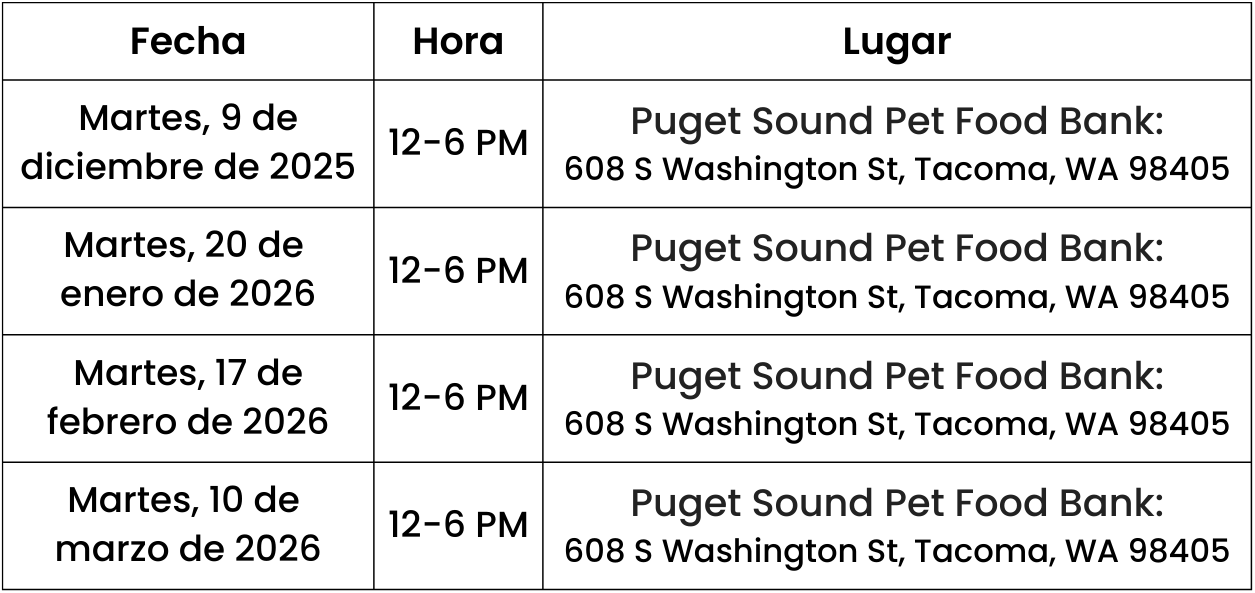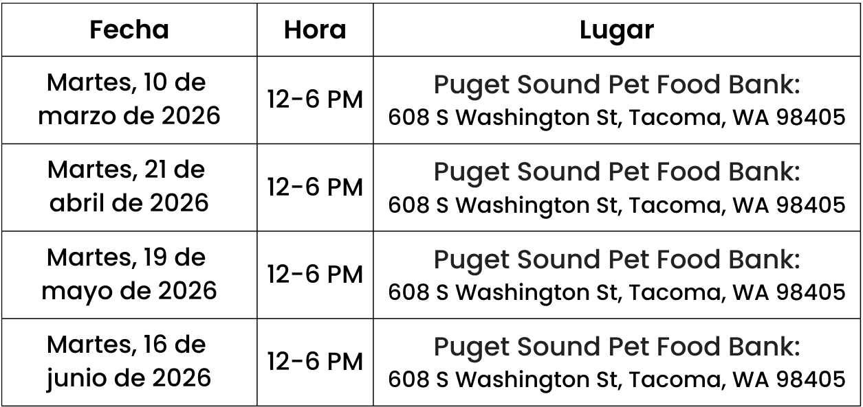 Todos los servicios del Banco de Alimentos para Mascotas de Puget Sound son para los residentes del Condado de Pierce con cita previa. Las citas son rápidas; si llega tarde, es posible que no podamos atenderlo. Nos esforzamos por reducir los tiempos de espera al máximo, pero tenga en cuenta que podría tener que esperar un poco al llegar, así que traiga lo necesario para su comodidad. Agradecemos su comprensión y paciencia mientras trabajamos arduamente para satisfacer las necesidades de nuestra comunidad.